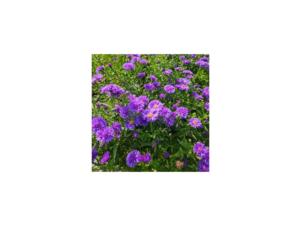 Nižší astra s krásnými modrými květy a žlutým středem.