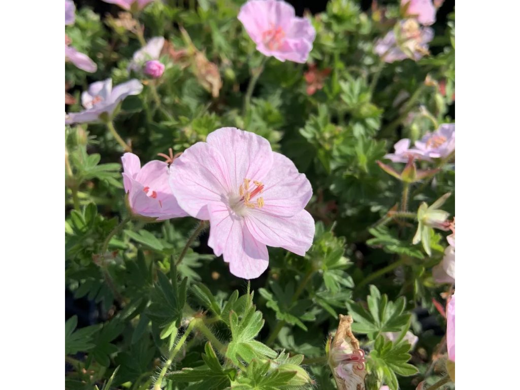 Jemný nízký kakost se světle růžovými květy, nenáročný na pěstování. Na podzim okraje listů barví do červena.