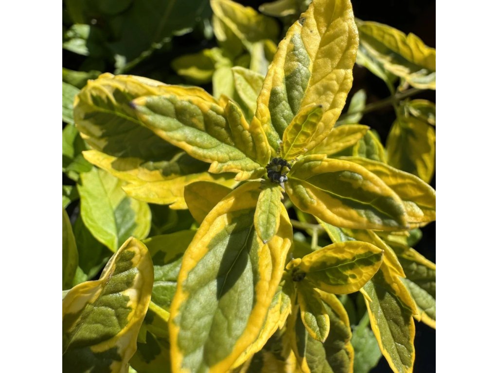 Atraktivní polodřevitý keř, který kvete výraznými modrými květy, listy žletě panašované. Nenáročný, na jaře sestřihneme cca 20 cm od země.