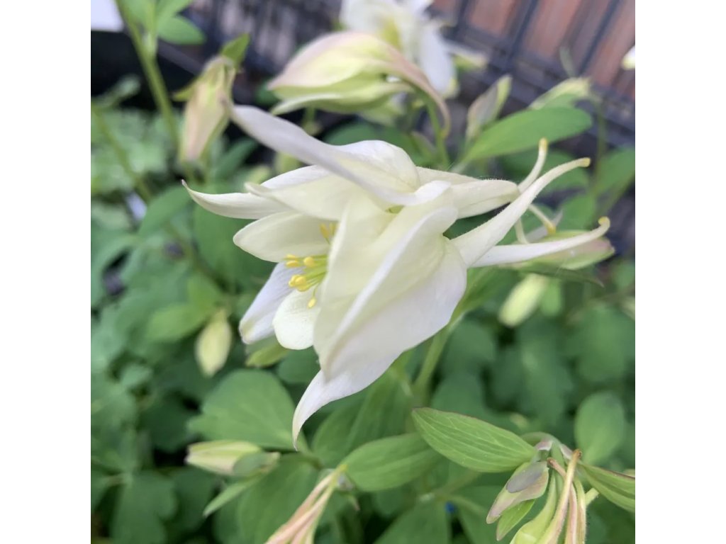 Kompaktní, nižší, nápadně kvetoucí rostlina s velkým bílým větem.