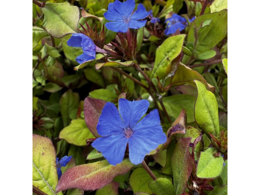 Rohovec ( Olověnec) se cení pro svou dlouhou dobou kvetení, nemá rád přemokření, na zimu přikrýváme.